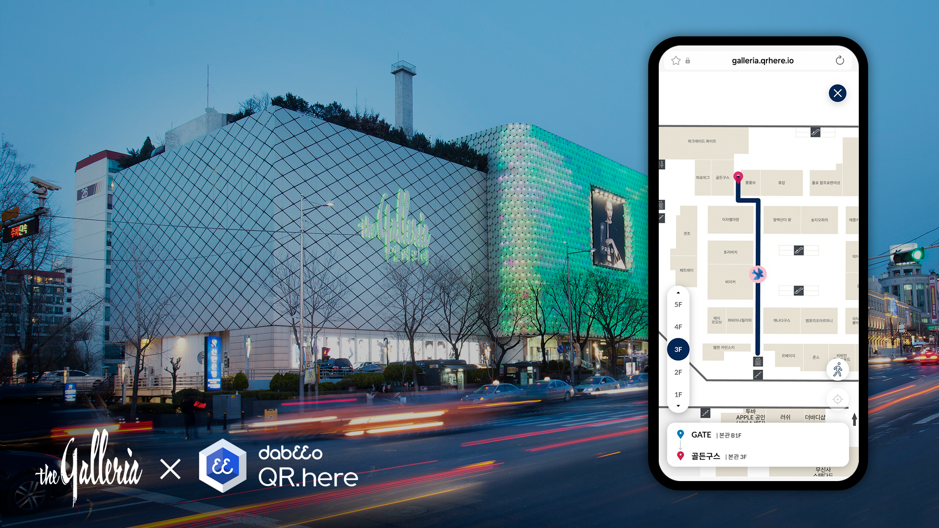 The newly introduced “QR.here” service is powered by real-time digital map data managed through Dabeeo’s integrated geospatial platform, Dabeeo Studio. By scanning QR codes installed throughout Galleria department stores, users can instantly access location-based floor maps and store information—without the need to install a separate application. It is a QR-based integrated navigation solution designed for seamless indoor wayfinding.